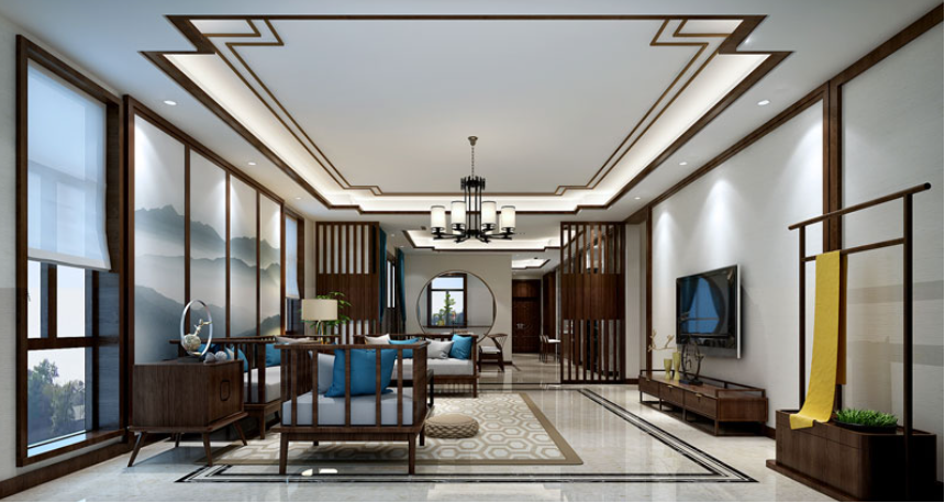 设计师以开放性设计展现现代中式美学,整体布局追求沉稳大气。在一层空间中,将餐厨区域与客房区功能对调,实现睡房区域安静,餐厨公共区域开放式生活方式与会客厅、户外庭院景观共享。选材上强调现代材质与传统元素紧密结合,明清家具、挂屏、字画、古玩、盆景巧妙陈设,电控玻璃打造科技感,营造出新东方意境。
